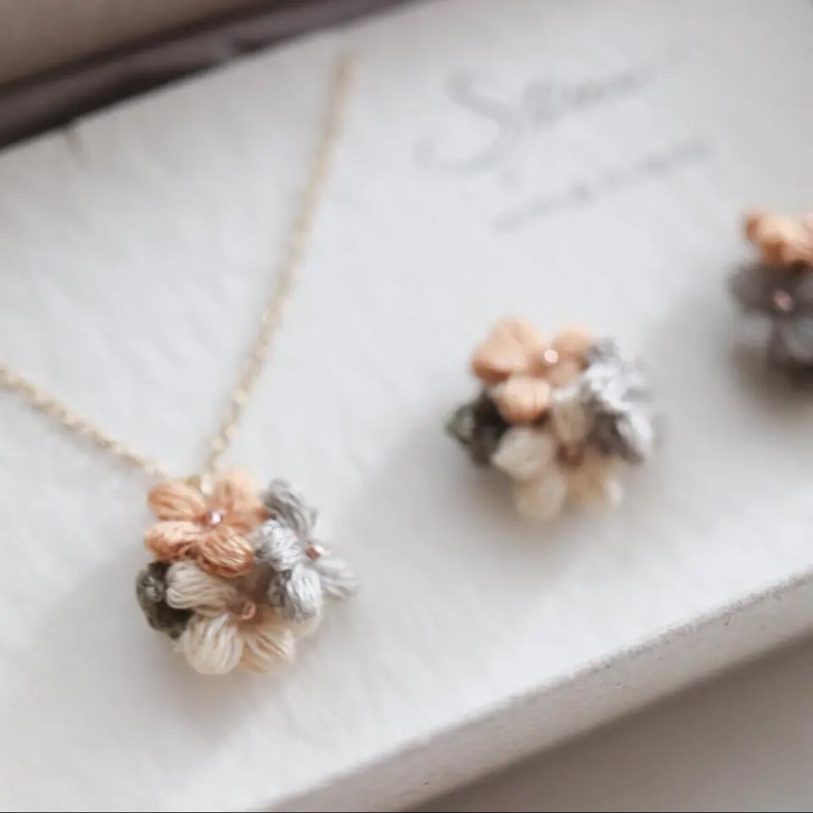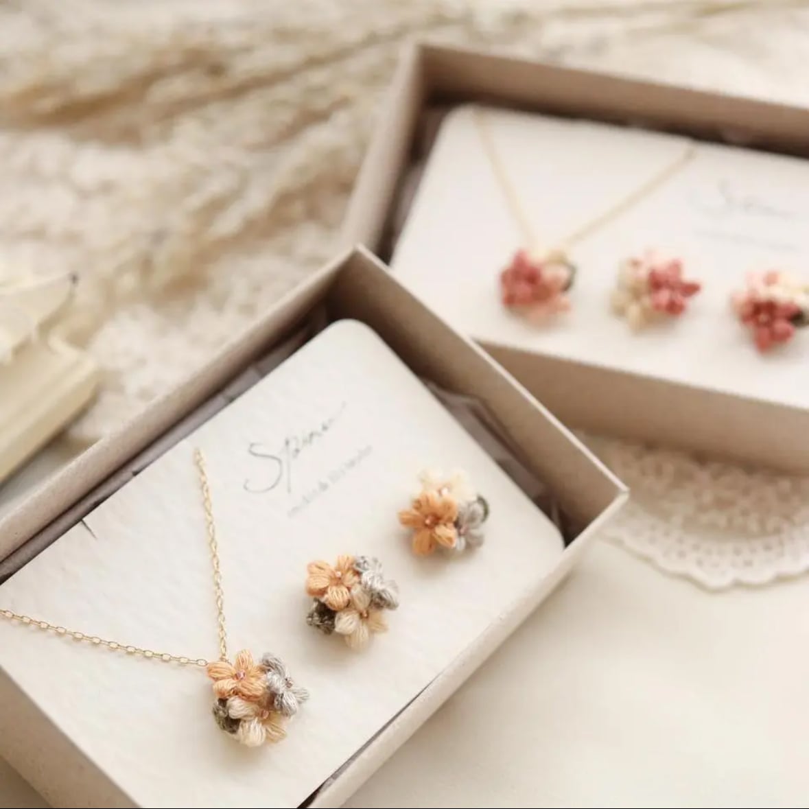 耳飾りとネックレスは、通常同じお花色でお届けします。