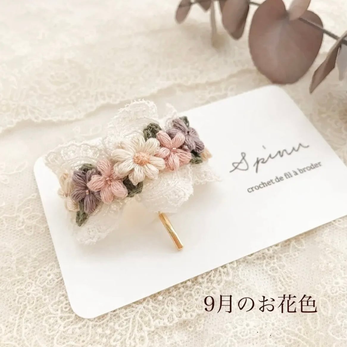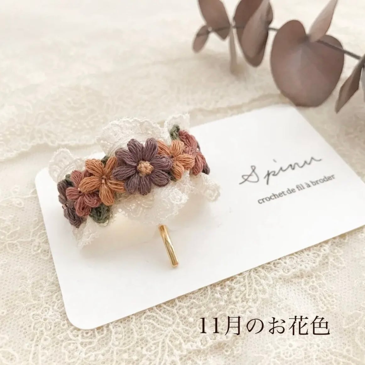 刺繍糸1本どりでレース編みしたお花モチーフを使い